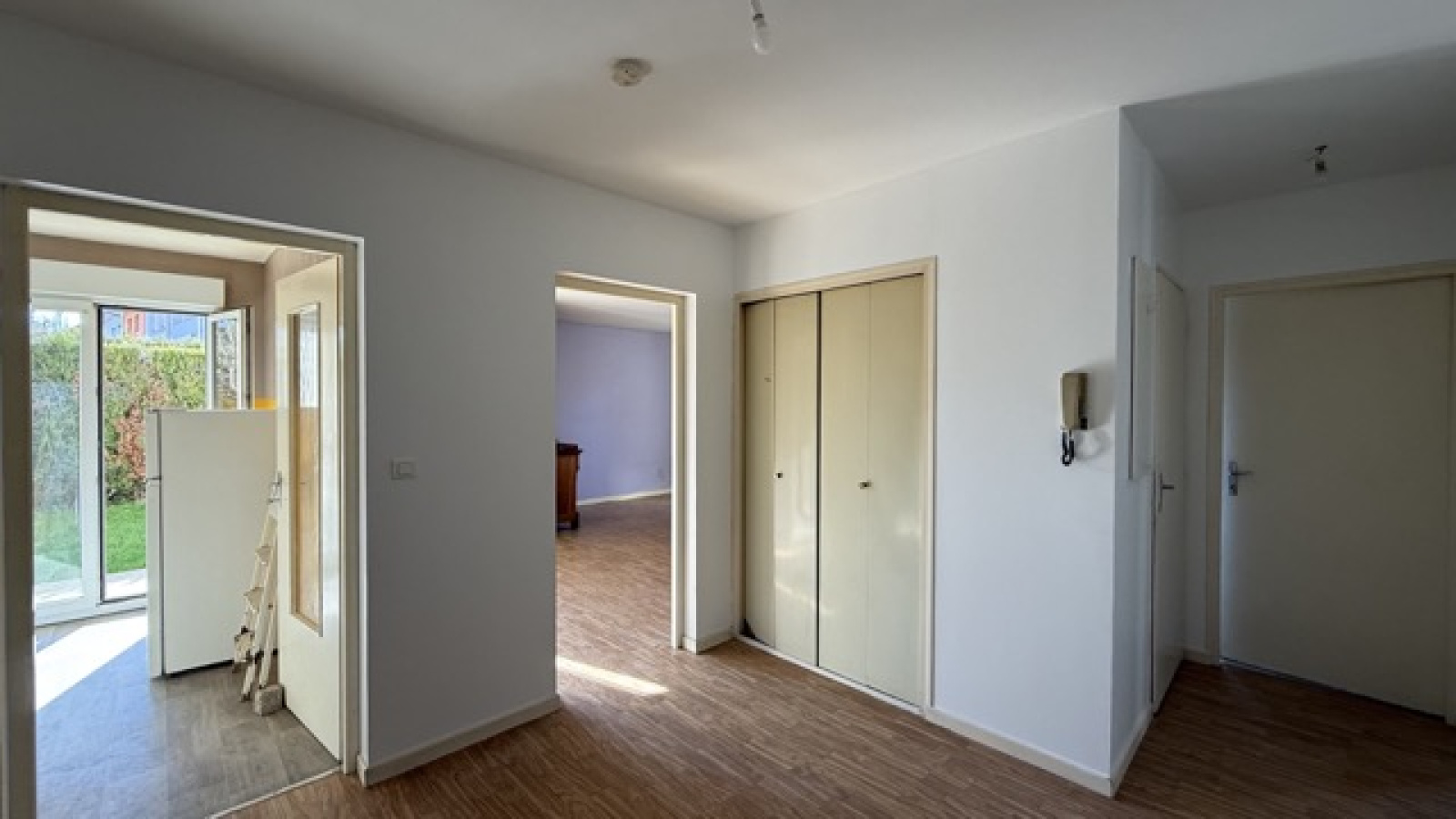 Cet appartement est composé d'une grande entrée avec dégagement et placard, cuisine séparée avec accès terrasse couverte et jardin, et office/buanderie, pièce de jour avec accès terrasse couverte et jardin, deux chambres, salle de bains (lavabo et baignoire), W.C. séparé.
